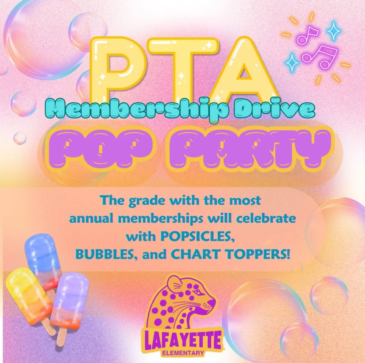 The PTA supports critical academic needs and resources such as Field Trips, Assemblies, Tutoring, Room/Teacher Supplies, Community Events, Technology, and much more! Sign up today to help your Lafayette learner earn a donut Disco Party!