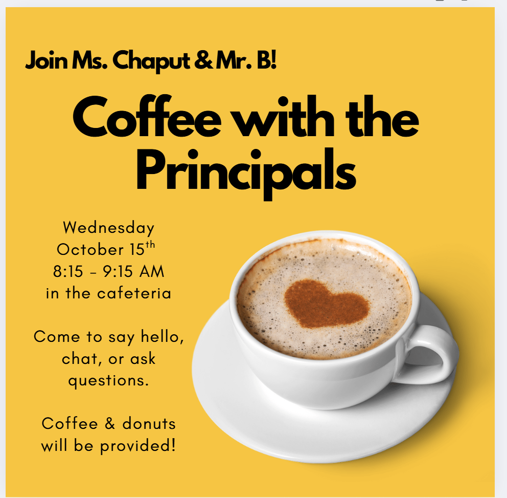 Have a few minutes to spare after drop-off to drink some coffee (on us) and get to know our principals? Come join Ms. Chaput & Mr. B for coffee and donuts in the Lafayette cafeteria. You can come to say hello, chat about what's on your mind, or just eat all the sweets.